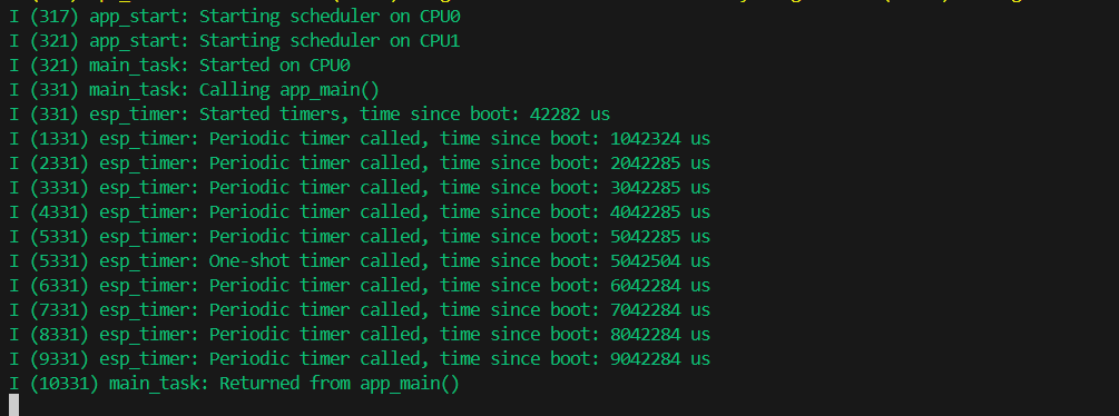 ESP_LOGI(TAG, "Started timers, time since boot: %lld us", esp_timer_get_time());