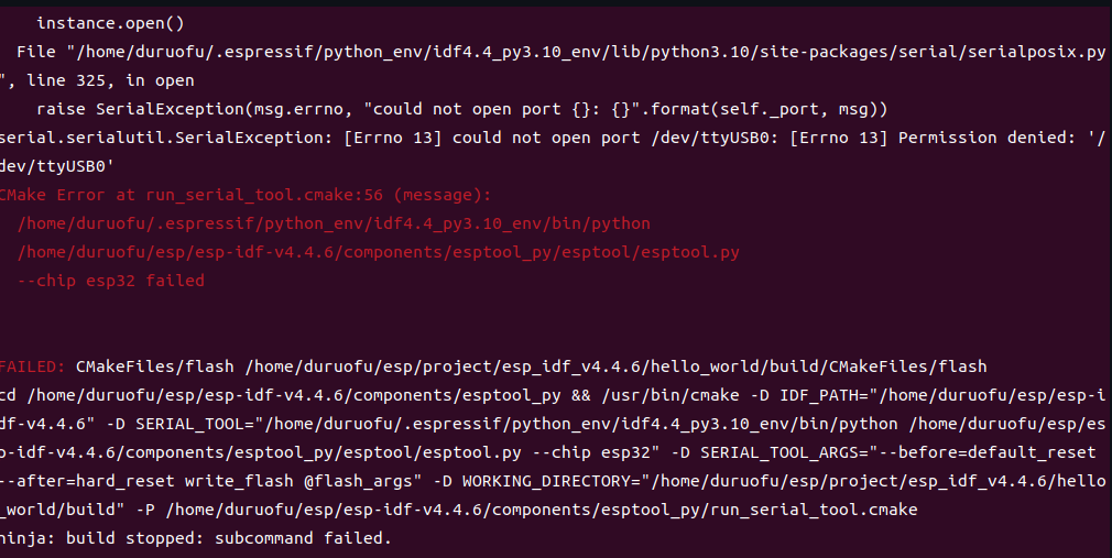 FAILED: CMakeFiles/flash /home/duruofu/project/Mock-IoT-Device-ESP32/build/CMakeFiles/flash解决办法: