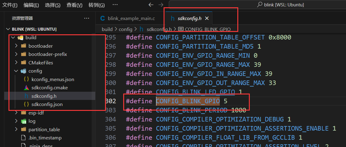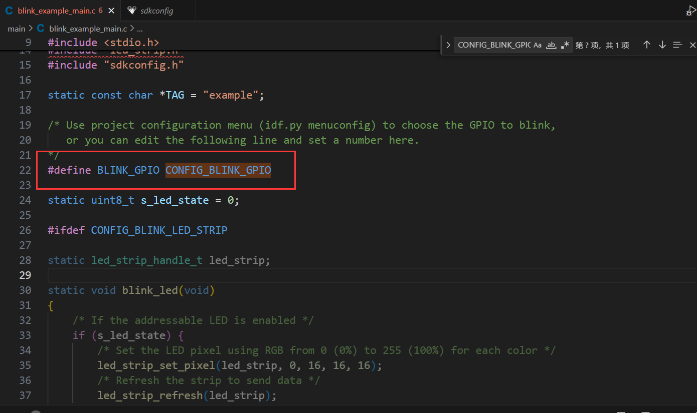 最后我们只需要在对应的c文件里引用sdkconfig.h这个头文件,我们就可以使用我们自定义的这些宏,还需要说明的一点是这些宏会被默认加上CONFIG_前缀,所以我们定义的BLINK_GPIO在实际使用时应该写作:CONFIG_BLINK_GPIO