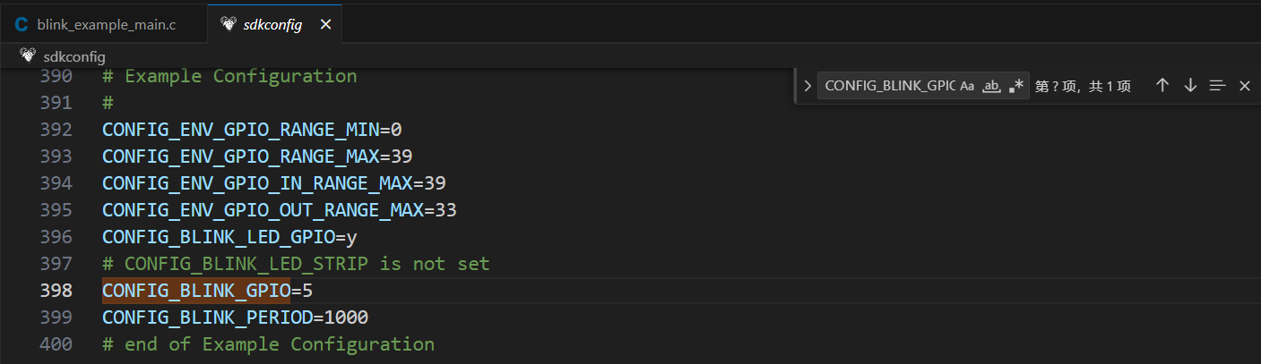 所以sdkconfig.h里的宏定义源自于sdkconfig文件,在sdkconfig文件中搜索CONFIG_BLINK_GPIO宏定义: