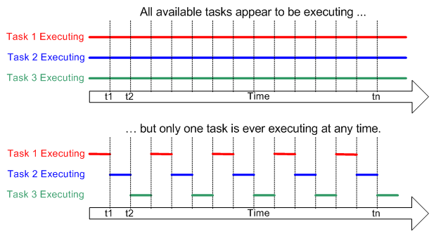 常规单核处理器一次只能执行一个任务,但多任务操作系统可以快速切换任务, 使所有任务看起来像是同时在执行。