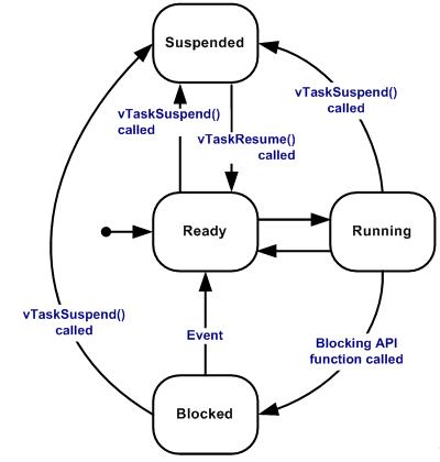 - 准备就绪 准备就绪任务指那些能够执行(它们不处于阻塞或挂起状态), 但目前没有执行的任务, 因为同等或更高优先级的不同任务已经处于运行状态。