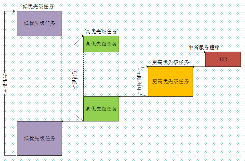 在裸机系统中,所有的操作都是在一个无限的大循环里面实现,支持中断检测。外部中断紧急事件在中断里面标记或者响应,中断服务称为前台,main 函数里面的while(1)无限循环称为后台,按顺序处理业务功能,以及中断标记的可执行的事件。小型的电子产品用的都是裸机系统,而且也能够满足需求。但当程序复杂之后,这样的裸机程序难以阅读和维护。