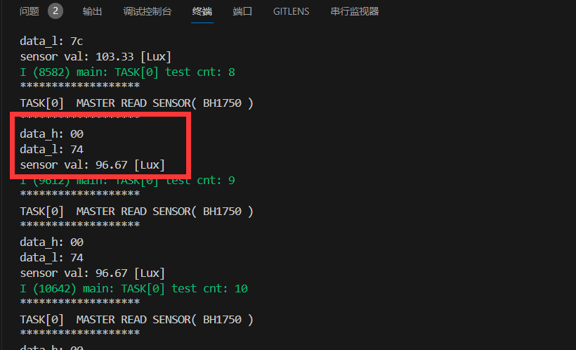 }这段程序是一个基于ESP32开发板的示例代码,用于通过I2C总线与BH1750光照传感器通信。程序中首先进行了I2C主设备的初始化配置,然后定义了读取传感器数据的函数i2c_master_sensor_test。在任务函数i2c_task中,循环读取传感器数据并打印输出,显示光照传感器采集到的数据值。最后,在app_main函数中初始化I2C,并创建了一个任务来执行I2C数据采集操作。