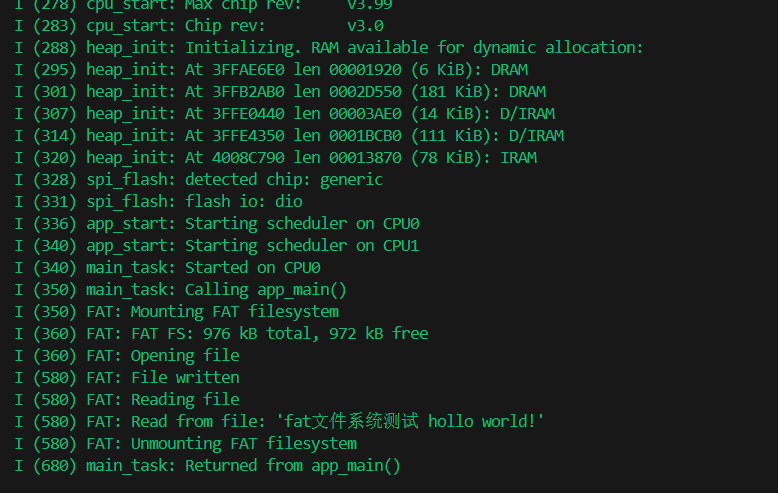 使用esp_vfs_fat_spiflash_mount_rw_wl()在SPI闪存中初始化FAT文件系统并在VFS中注册。
