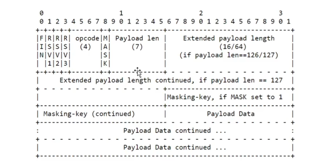3. Opcode:4 位,用于表示消息类型,如 0x1 表示文本消息,0x2 表示二进制消息,0x8 表示关闭连接等。