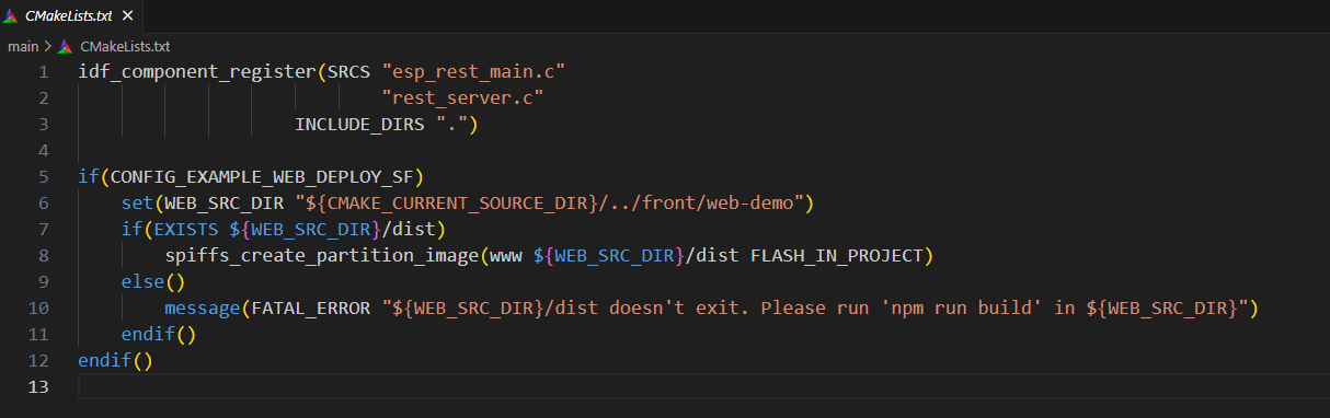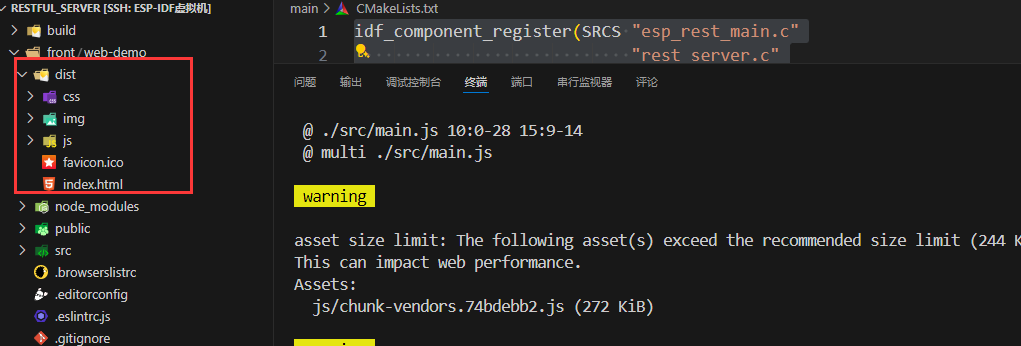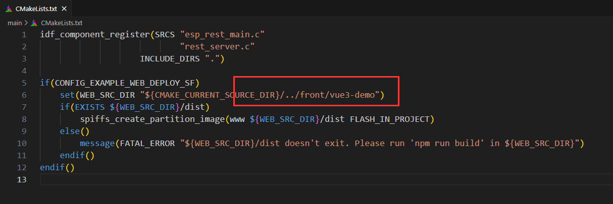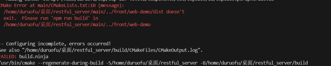提示我们找不到···/front/web-demo/dist这个目录,这个目录是构建完成的网页文件,在main组件的CMakeLists.txt文件里可以看到: