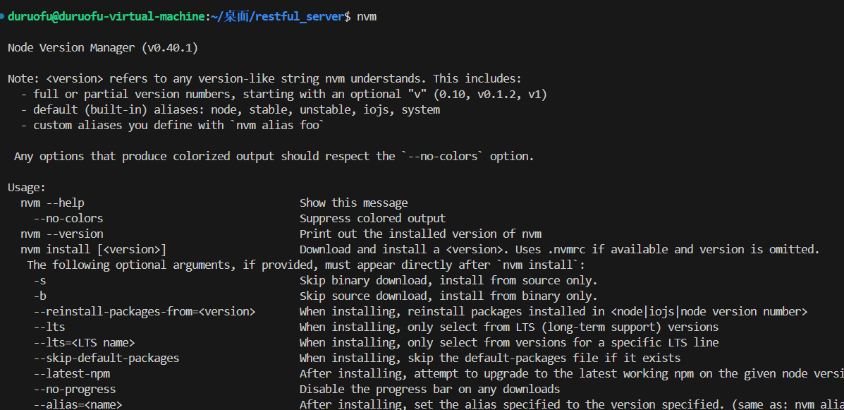 curl -o- https://raw.githubusercontent.com/nvm-sh/nvm/v0.40.1/install.sh | bash输入nvm验证,可以看到NVM已经安装好了(需要新打开一个终端):