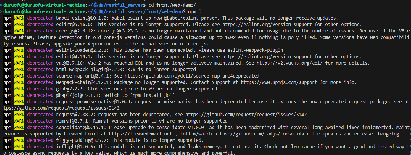 可以看到,示例里的前端项目实在是太老旧了,所依赖的大部分库的对应版本已经停止支持了。下载完成后使用npm run build构建项目: