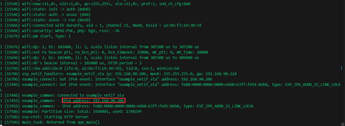 回到项目根目录,使用命令$ idf.py -p PORT build flash monitor 编译烧录代码,这里的PORT是开发板对应的端口,烧录成功,ESP32连接到WiFi之后,会打印出自己的IP地址: