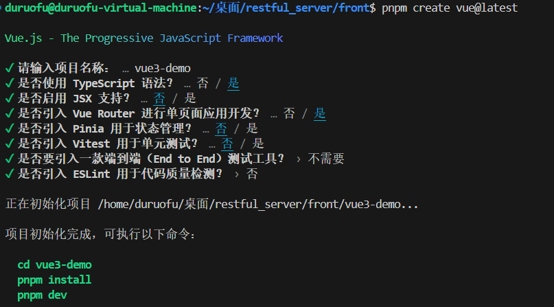 创建项目:pnpm create vue@latest,对应的选项可以按照个人习惯进行选择: