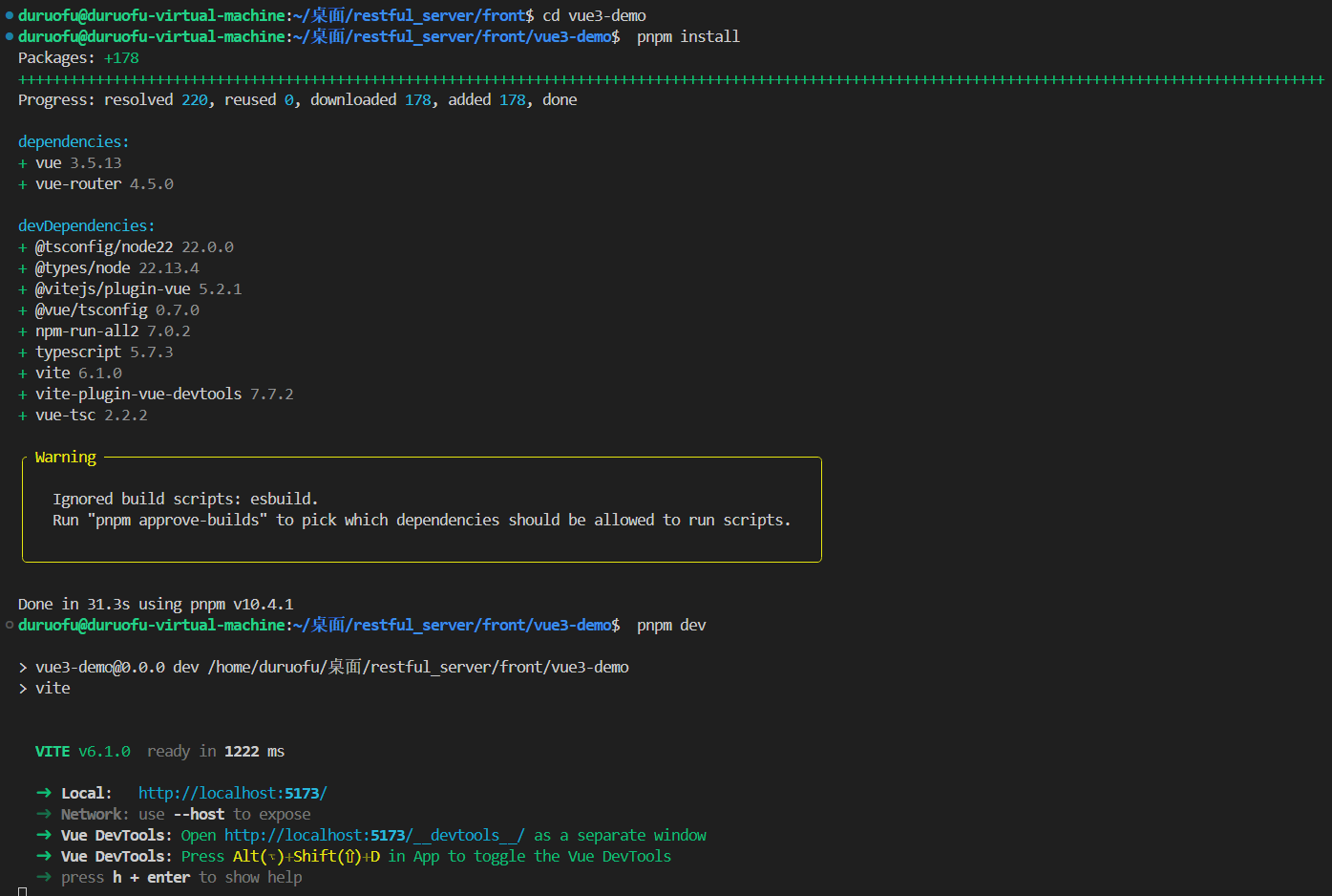 进入到新建的Vue3项目文件夹里,使用pnpm install下载依赖,然后使用pnpm dev预览项目
