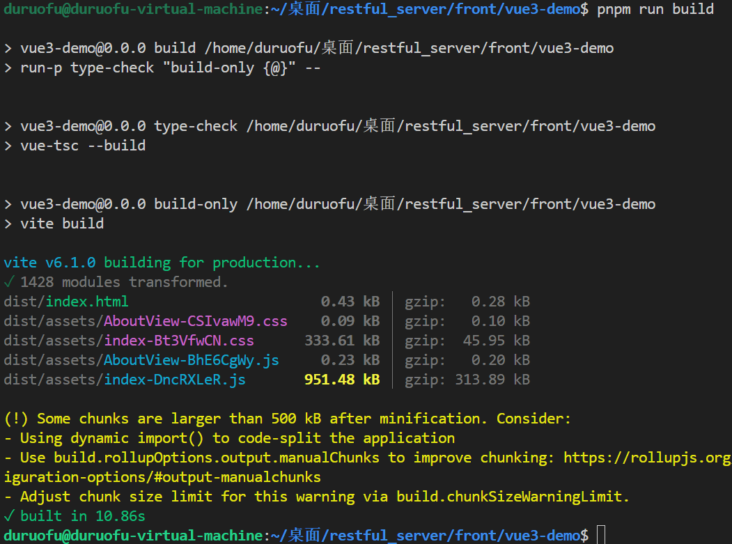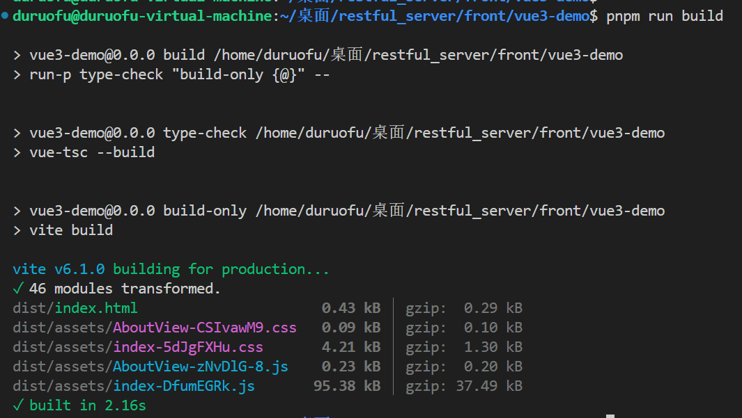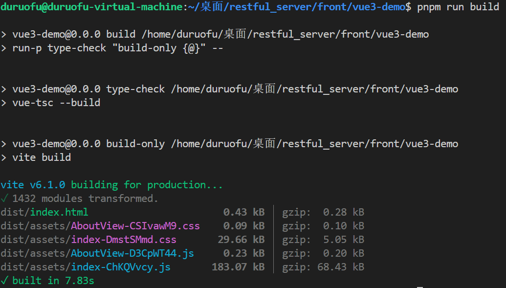 然后还是先编译工程,烧录到开发板进行测试,使用pnpm run build构建前端项目: