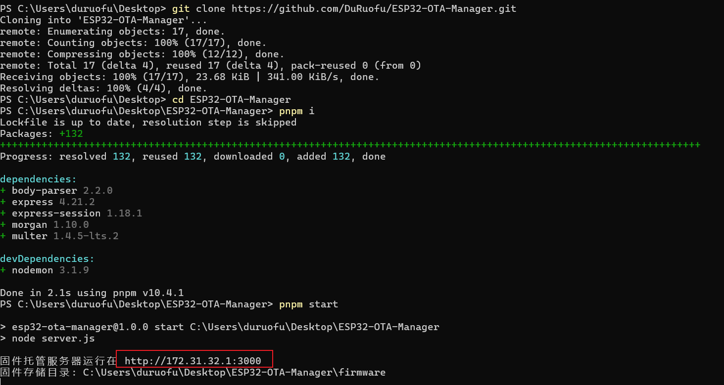 git clone https://github.com/DuRuofu/ESP32-OTA-Manager.git进入文件夹,并安装依赖: