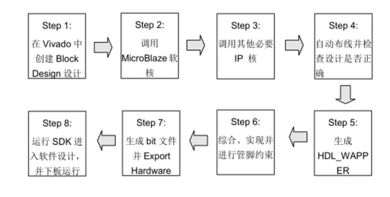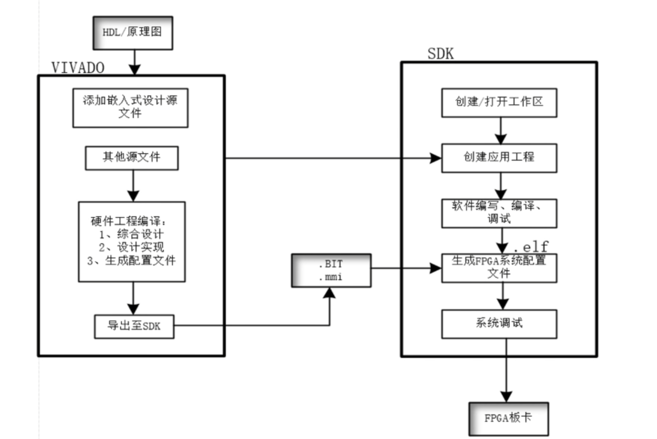 FPGA是可编程的硬件逻辑电路·microblaze是一种处理器CPU电路·使用microblaze,相当于就是在FPGA内部做了一个CPU在里面,可以用C语言写程序·在这个CPU上跑C语言的软件程序,FPGA偏向逻辑·但是做控制比较麻烦,用CPU跑C程序控制比较方便。这就是嵌入式系统,包括嵌入式硬件系统部分以及运行在其硬件的嵌入式软件。因此嵌入式系统的开发流程需要分为嵌入式硬件与软件两个部分。在FPGA中通过FPGA内部逻辑资源搭建了嵌入式硬件系统,而在其中的CPU核上需要编写嵌入式程序。
