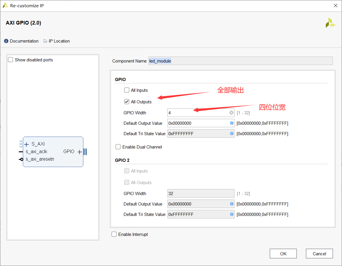 - AXI GPIO IP核简介:PL部分核ARM通信,依靠的就是AXI总线,添加AXI GPIO IP核,利用PL的资源来扩充GPIO资源