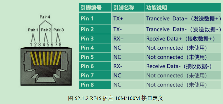RJ45 接口定义以及各引脚功能在不同通信速率下的定义有区别,图 52.1.2 是在 10M/100M 通信速率下 的定义,由下图可知,RJ45 插座只使用了 1、2、3、6 这四根线,其中 1、2 这组负责传输数据(TX+、 TX-),而 3、6 这组负责接收数据(RX+、RX-),另外四根线是备用的。