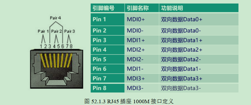 而在 1000M 的通信速率下,RJ45 插座的 8 根线都有用到,且都是双向引脚。需要说明的是,支持千 兆网通信的 RJ45 接口是向下兼容的,即也支持 10M/100M 通信速率,只不过不同的通信速率,其引脚功 能有区别。千兆网各引脚功能如下图所示: