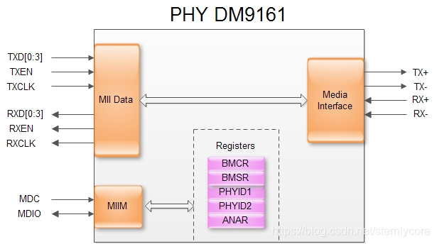 PHY(Physical Layer)是IEEE802.3中定义的一个标准模块,STA(Station Management Entity,管理实体,一般为MAC或CPU)通过MIIM(MII Manage Interface)对PHY的行为、状态进行管理和控制,而具体管理和控制动作是通过读写PHY内部的寄存器实现的。PHY的基本结构如下图: