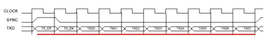 从波形可以看出,SYNC变高后的10个时钟周期内,TXD依次输出一组10bit的数据即TX_ER,TX_EN,TXD[0:7],这些控制信息和MII接口含义相同。在100M速率中,每一组的内容都是变换的,在10M速率中,每一组数据需要重复10次,采样任一一组都可以。