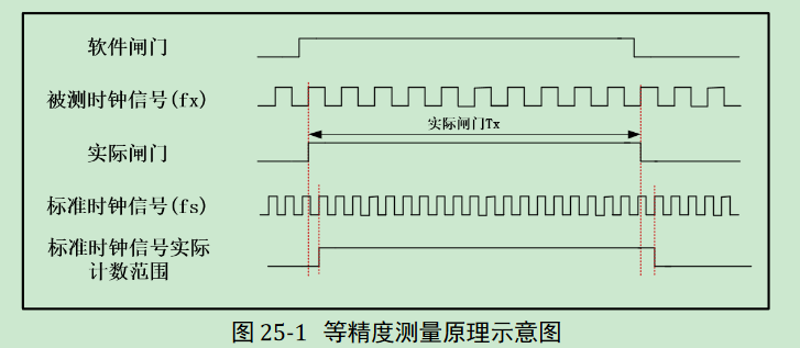 等精度测量法与前两种方式不同,其最大的特点是,测量的实际门控时间不是一个固 定值,它与被测时钟信号相关,是被测时钟信号周期的整数倍。在实际门控信号下,同时 对标准时钟和被测时钟信号的时钟周期进行计数,再通过公式计算得到被测信号的时钟频 率。