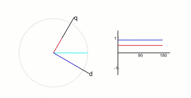 dq坐标系相对与定子来说是旋转的坐标系,转速的角速度和转子旋转的角速度相同,所以,相当于转子来说,dq坐标系就是静止的坐标系;而和id和iq则是恒定不变的两个值,具体如下图所示;