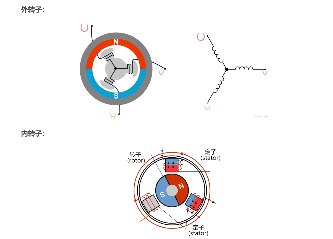 三相无刷电机根据转子与定子的位置关系,主要分为外转子(Outer Rotor)和内转子(Inner Rotor)两种结构,区别如下图: