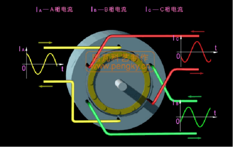 三个相A、B、C的电流随时间变换的曲线,如上图所示,他们之间存在120°的相位差。只要能够控制这个相位差为120°的sin状波形,就能够实现针对电机的控制。