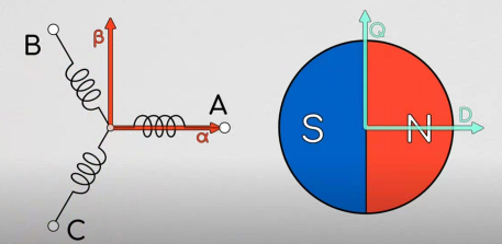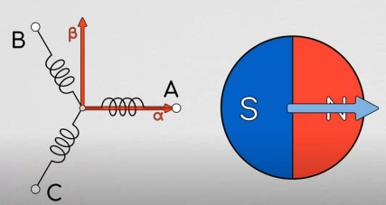 由克拉克变换,实际上我们已经成功对电机的正弦驱动三相曲线进行降维度,使之变成了一个两轴坐标问题,并且得到其转换关系。但是只有它是不够的,我们还需要将这个理论和旋转电机对应起来,也就是建立电机旋转时的数学模型。