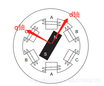 d轴方向与转子磁链方向重合,又叫直轴;q轴方向与转子磁链方向垂直,又叫交轴;d轴和q轴如下图所示;
