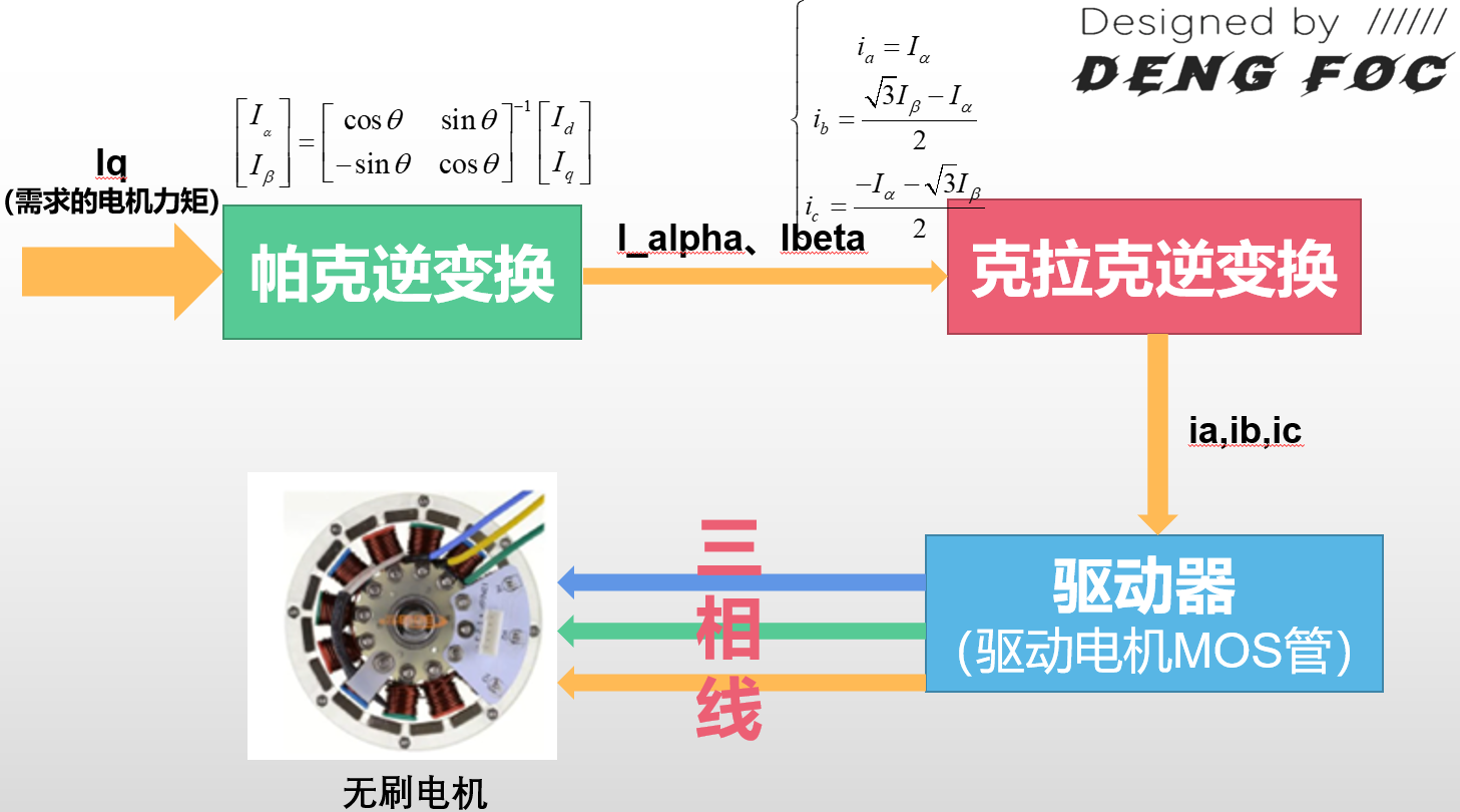 所谓FOC的过程,其实就是输入需求的电机力矩,最后得到对应的真实世界电机输出力矩的过程,如上图所示。而其中最核心的数学过程,就是帕克逆变换和克拉克逆变换,而这两个变换的数学公式上图中框图上面的公式所示,其中帕克变换可以对用户输入的Iq进行变换,根据电角度算出Iα和Iβ,接着,通过克拉克逆变换,三相电流ia,ib,ic能够被求出,最后这三个ia,ib,ic 能够用作控制指令输入到电机控制器硬件中进行电机的控制。