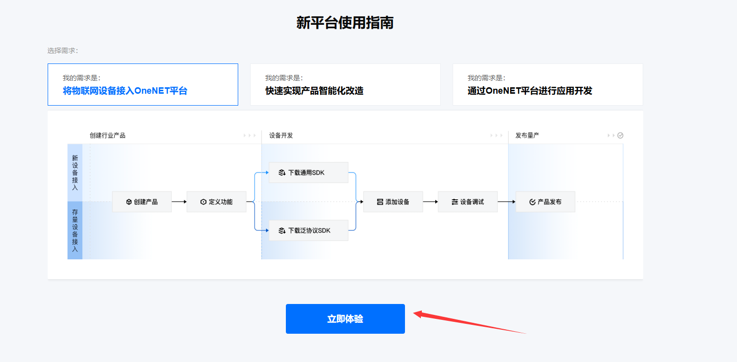 进入OneNET官网,自行注册账号后,找到OneNET物联网平台栏目, 点击立即体验: