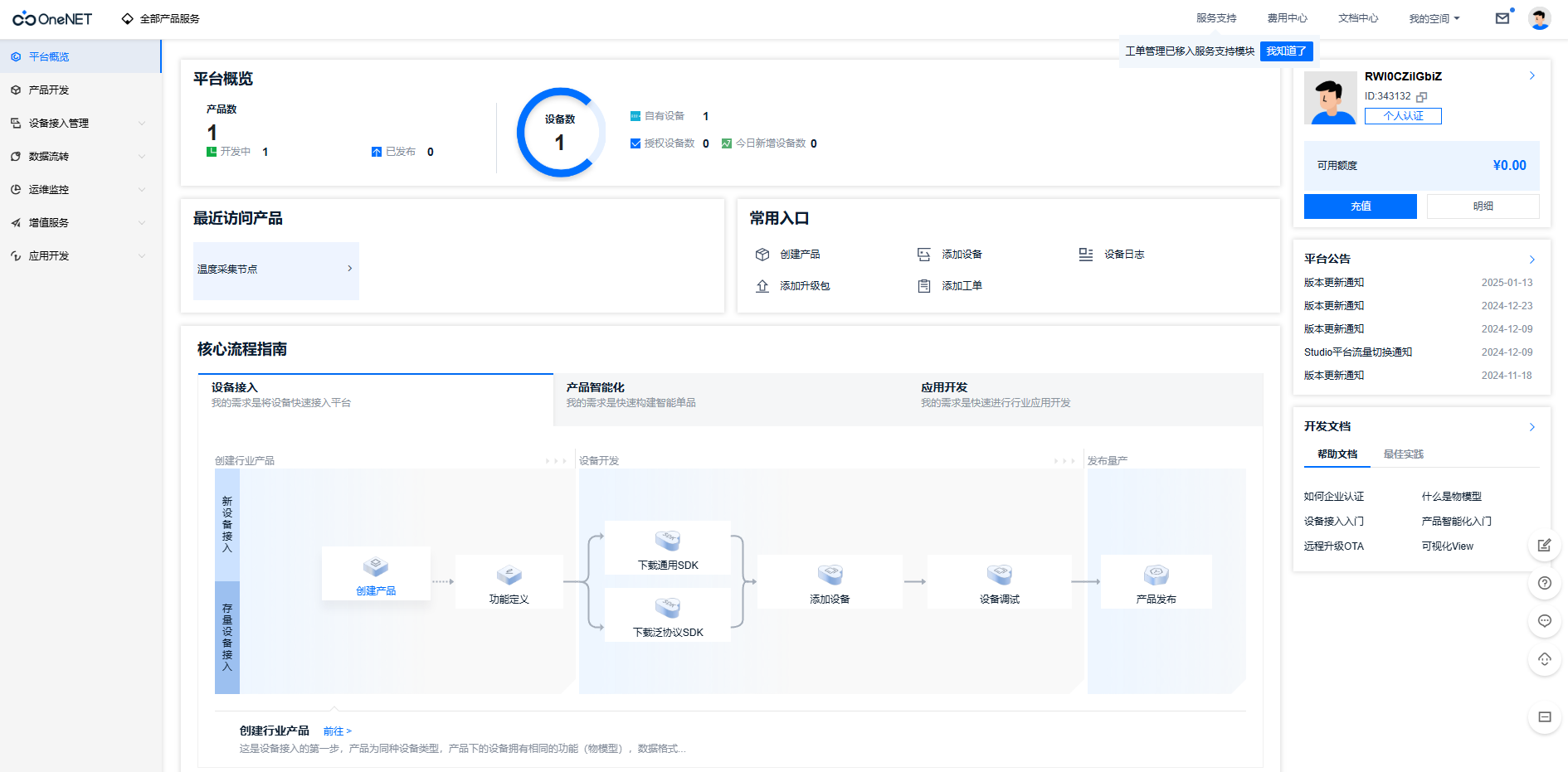 本文档记录 中国移动OneNET平台的基本使用、设备接入及相关配置内容。