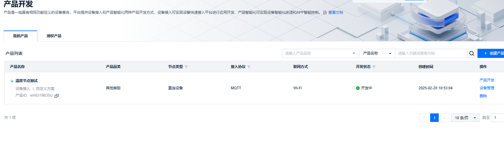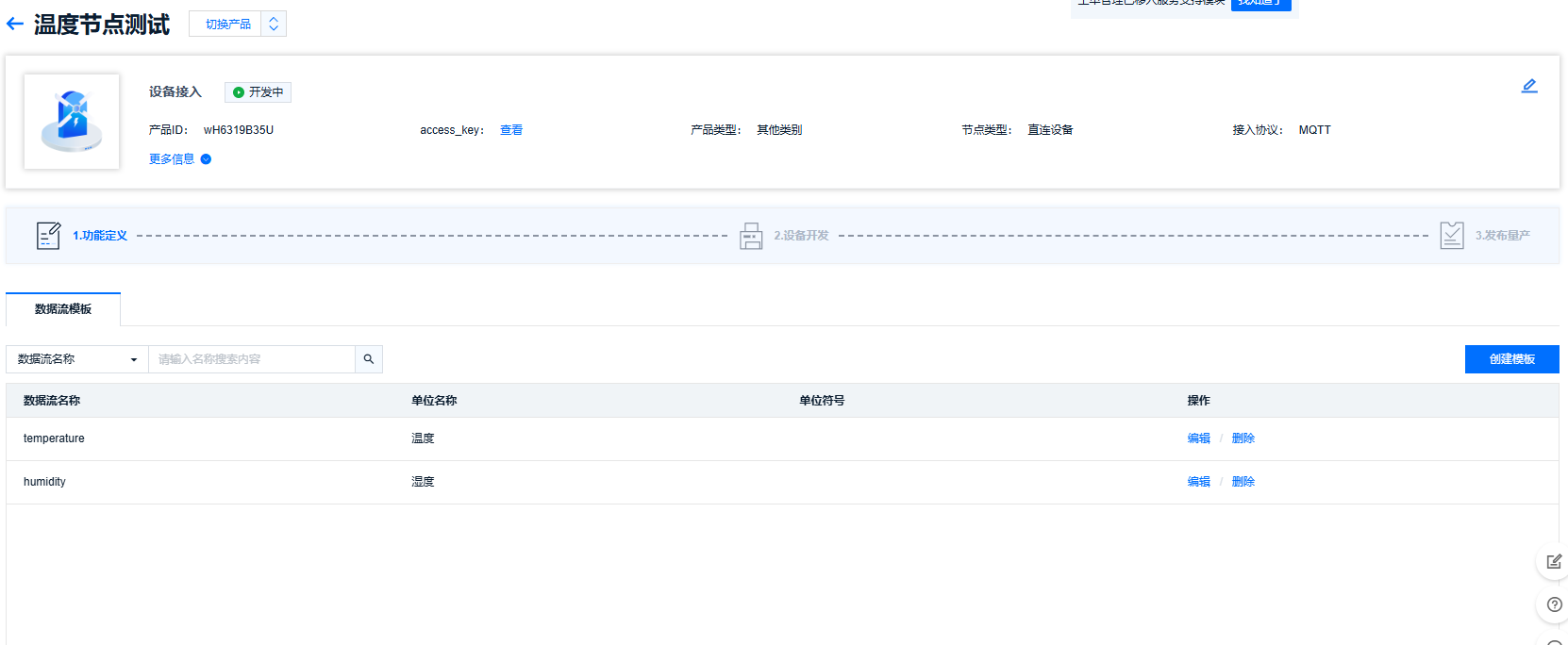 点击产品开发,定义我们的属性字段,这里我添加了温度和湿度: