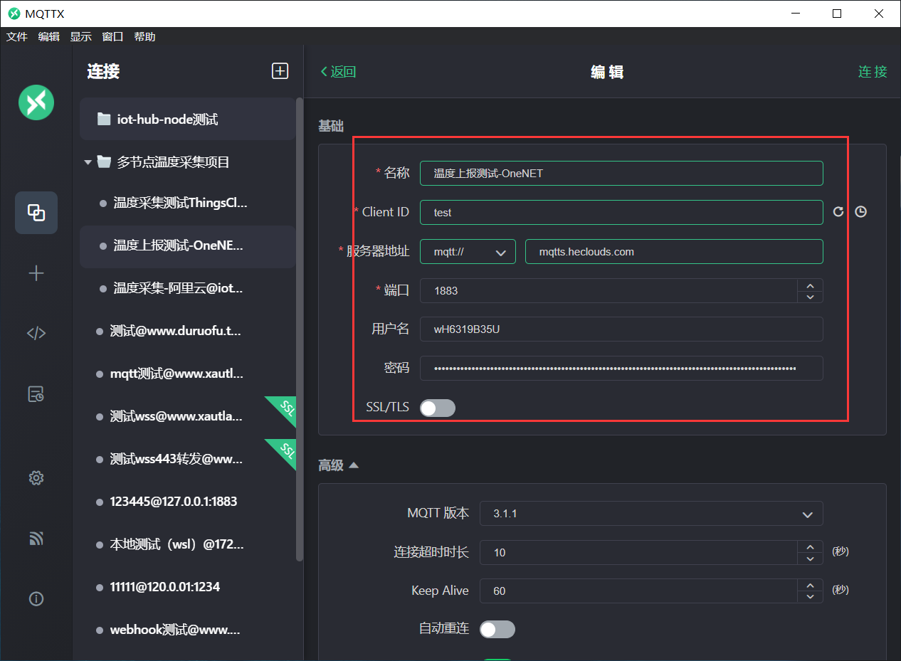 这样我们就得到了对应连接的密码,然后填到MQTTX里尝试连接:
