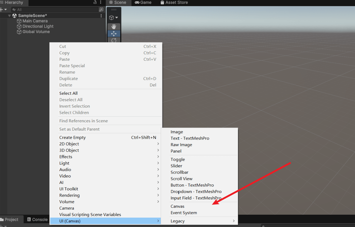 如图,Hierarchy 里可以看到 Canvas 和 EventSystem :