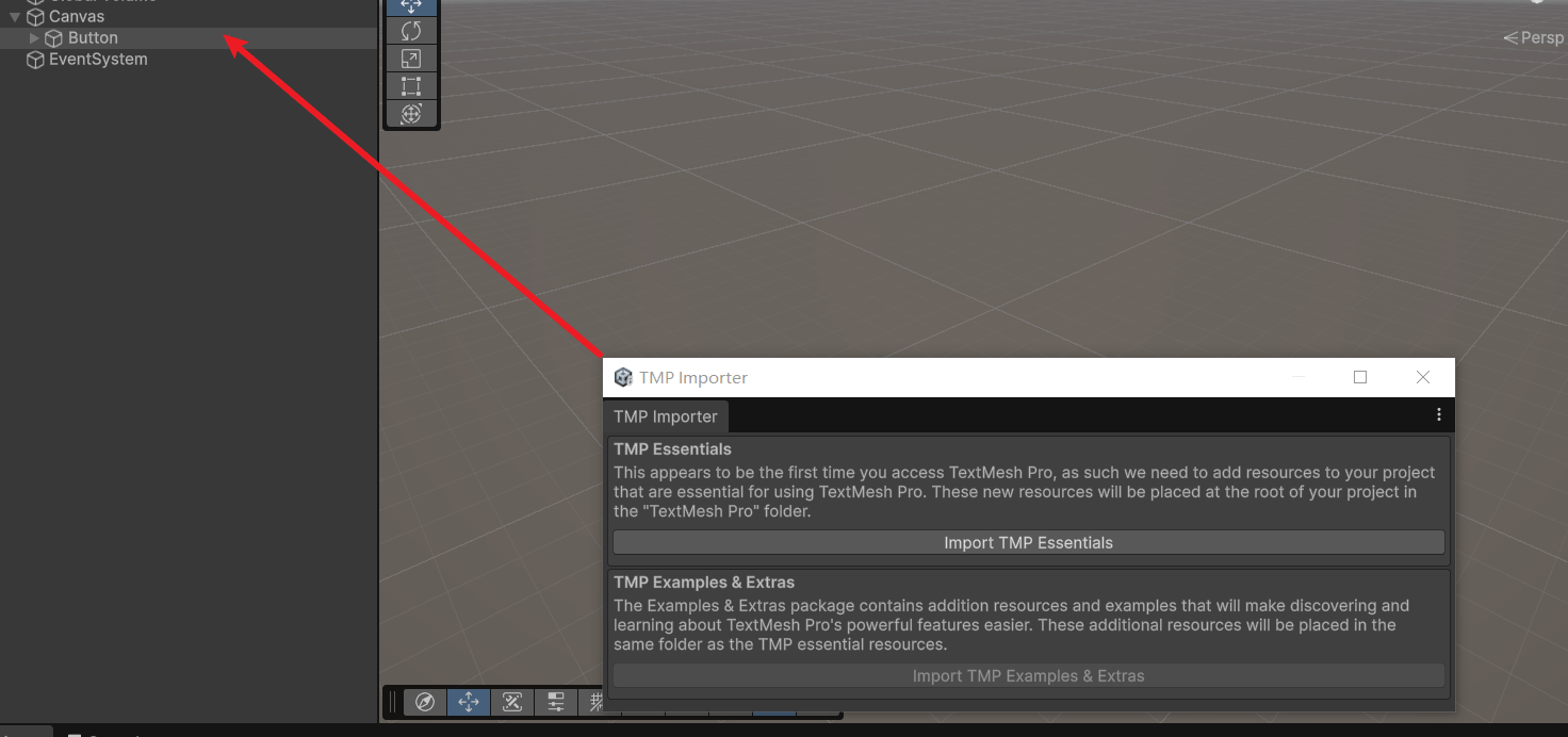 在这个Canvas下新建按键( UI-->Button (TextMeshPro)):