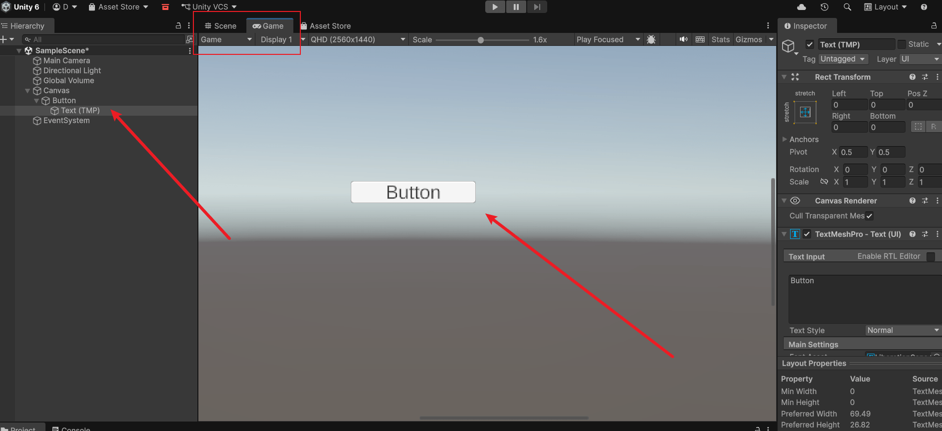 切换到 Game 视图,屏幕中间有一个按钮,可以选择按键修改文字