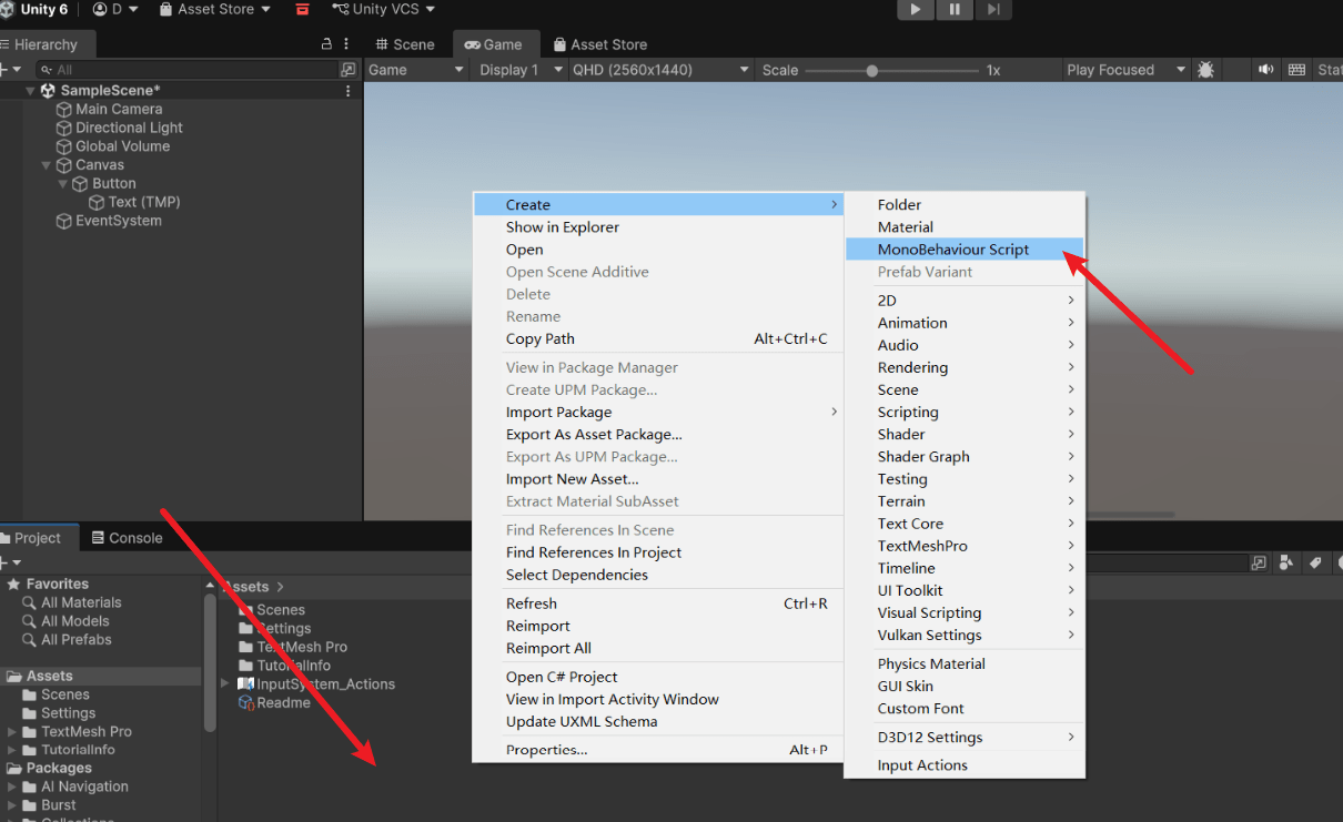 接下来为按键编写对应的脚本代码,在 Project(下面)窗口,展开 Assets,右键空白处选择创建MonoBehaviour Script,命名为TestButton
