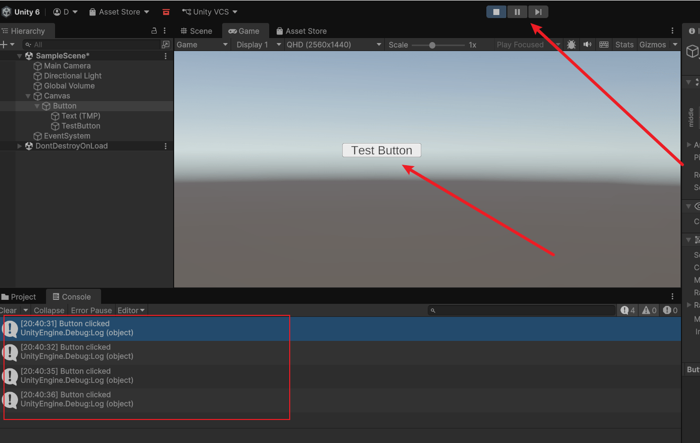 点击画面上的 Play ▶ ,用鼠标点按钮,Console 窗口出现了Clicked的日志: