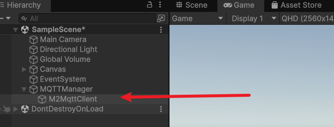 在 Hierarchy 新建一个物体,在 Hierarchy 面板 空白处右键,Create Empty,重命名为MQTTManager,然后把脚本挂上去。
