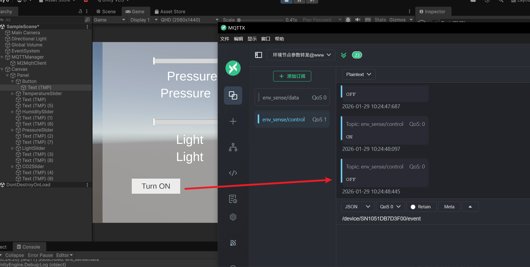 运行 Unity 场景。点击按钮即可发送 "ON" 或 "OFF" 消息到 env_sense/control 主题,设备端订阅此主题即可实现反向控制。