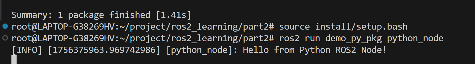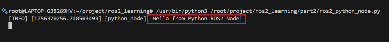 main()这段代码初始化 ROS 2 Python 节点 "python_node" 并保持其运行,直到程序被终止。并且在运行时会打印一个日志:Hello from Python ROS2 Node!,如下图: