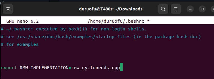 export RMW_IMPLEMENTATION=rmw_cyclonedds_cpp要永久生效我们还需要编辑下面的内容: