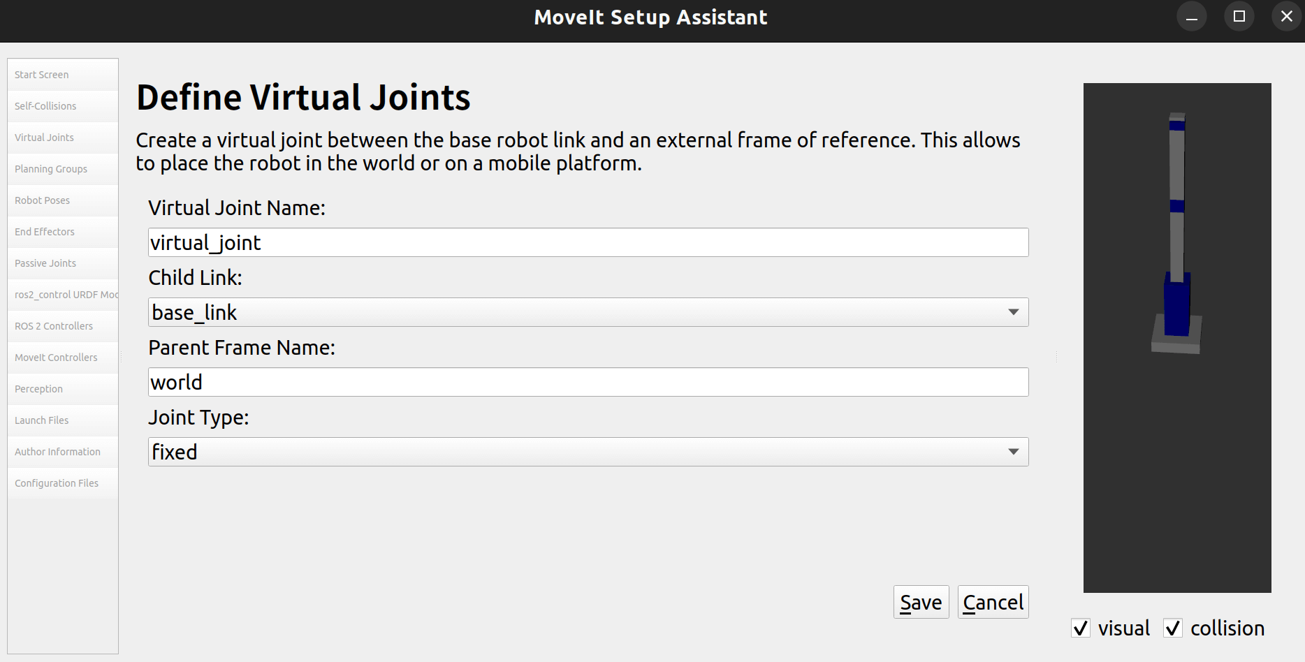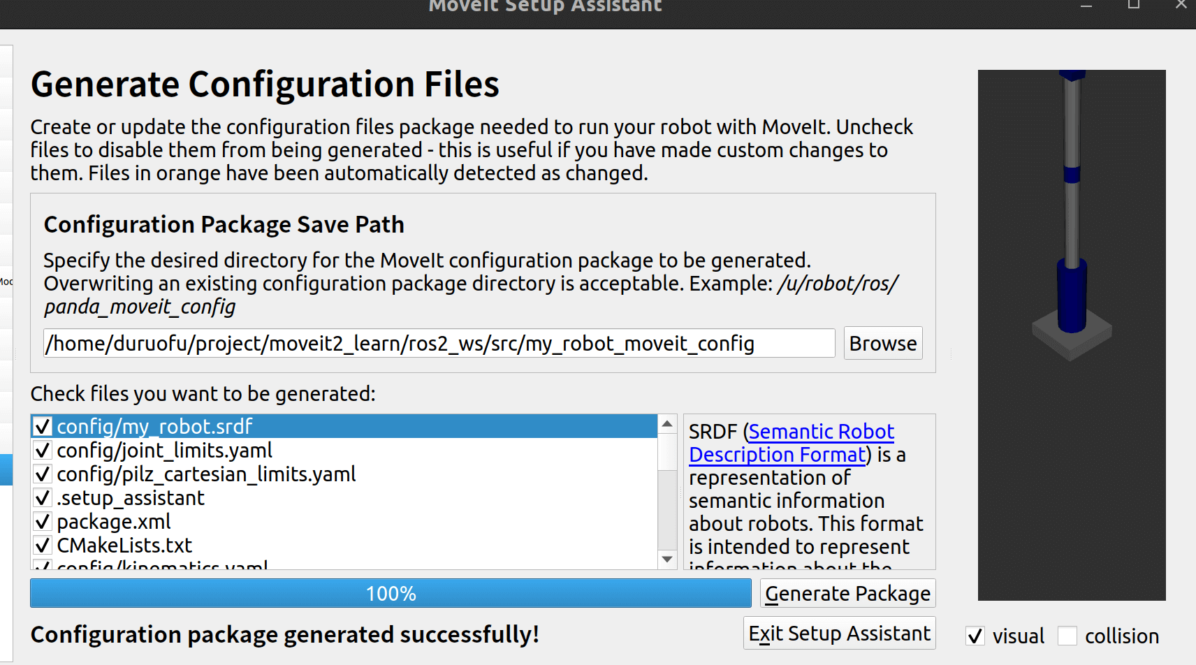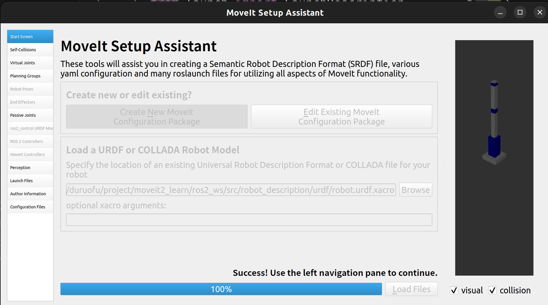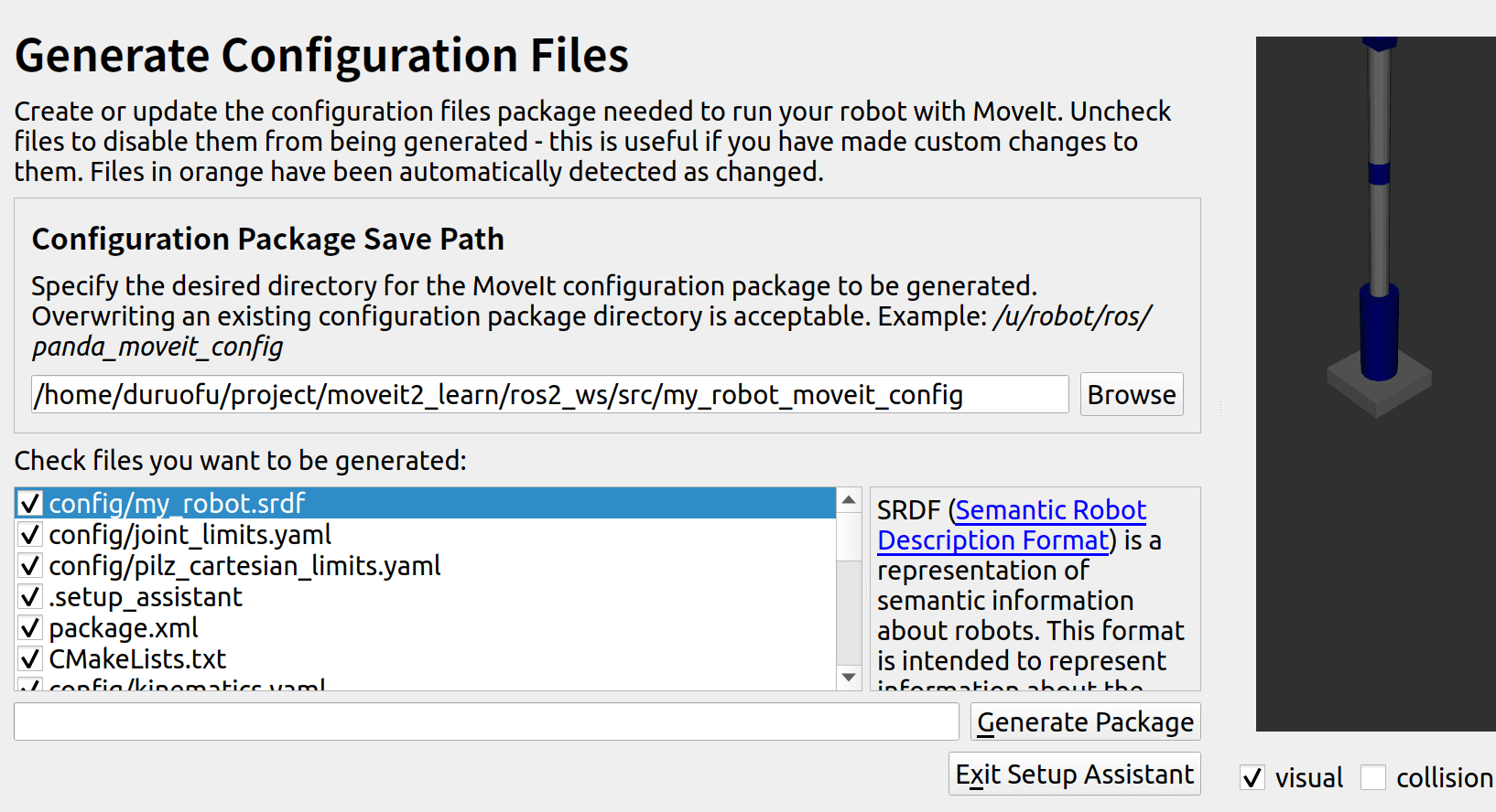 sudo apt install ros-humble-moveit-setup-assistant启动(在工作区目录下启动,否则下一步选择urdf文件会闪退):