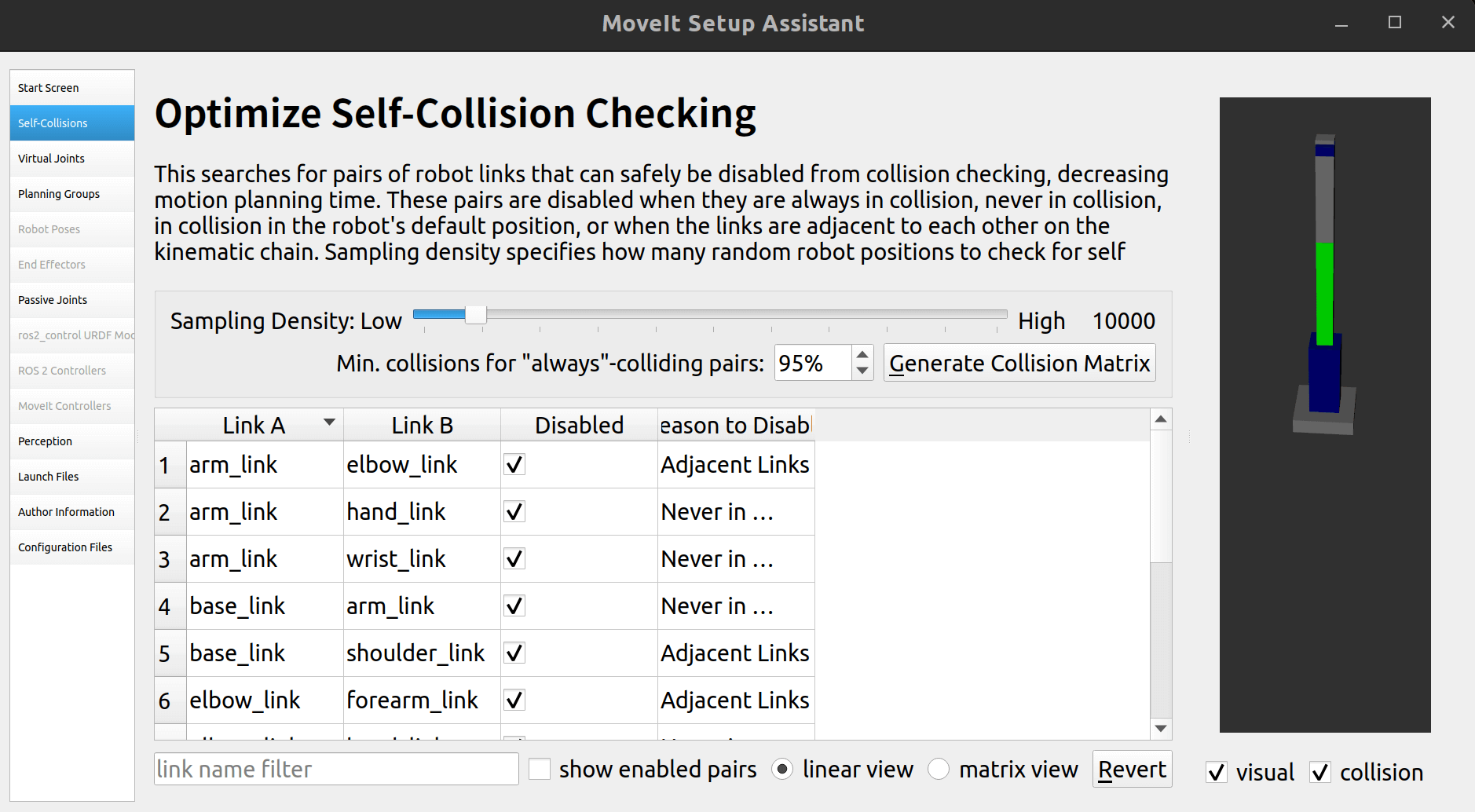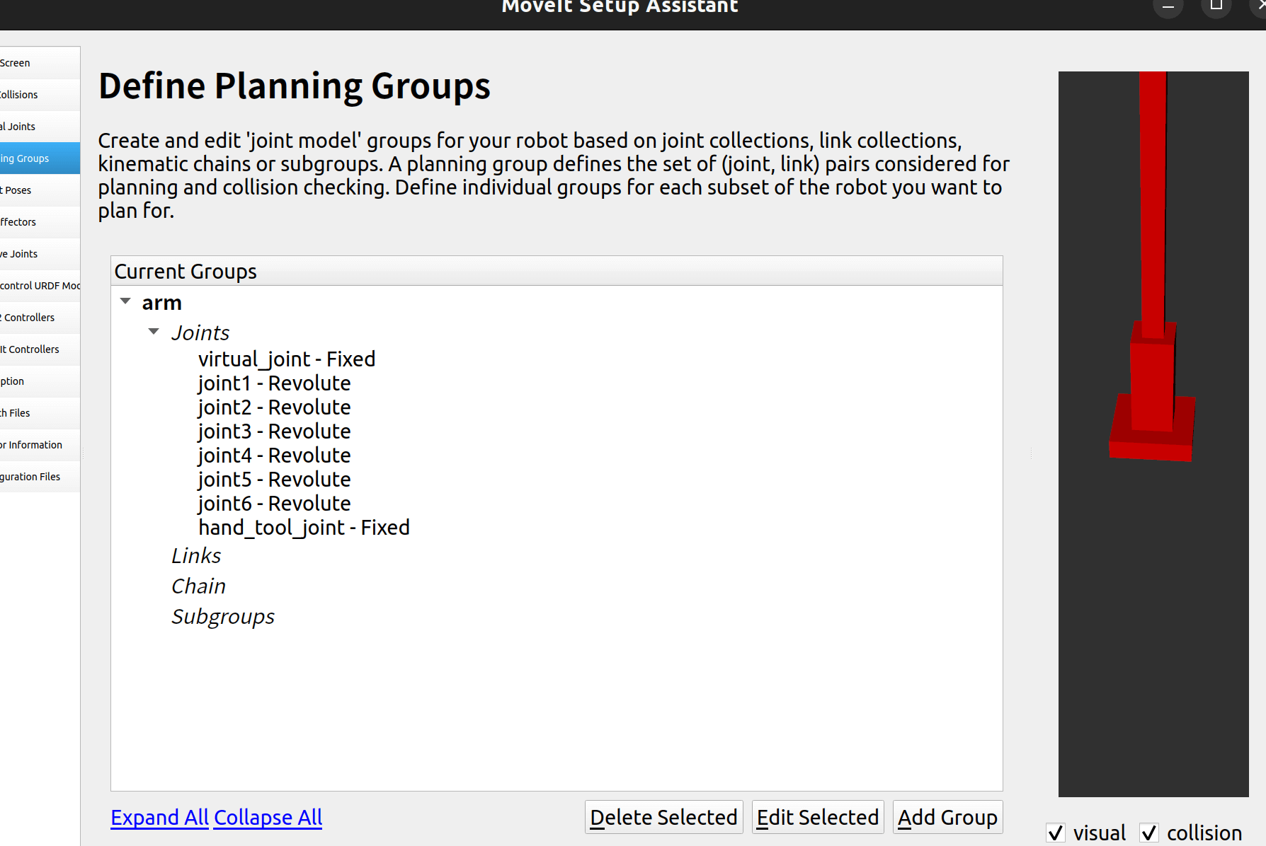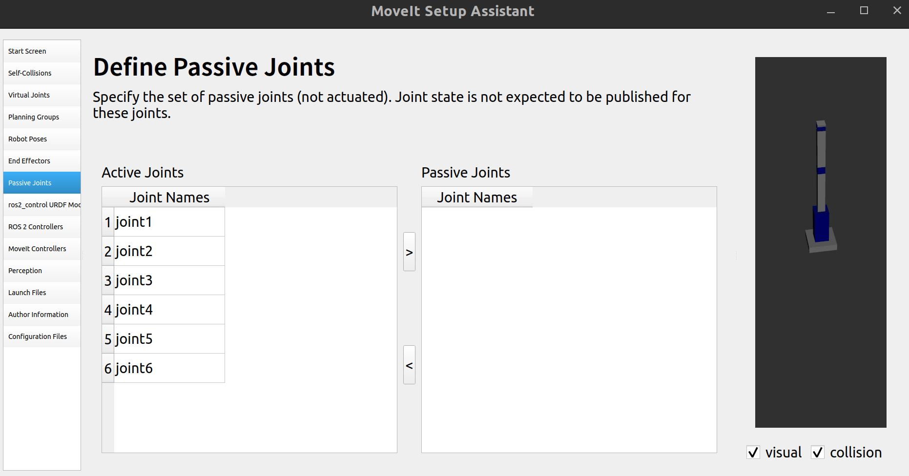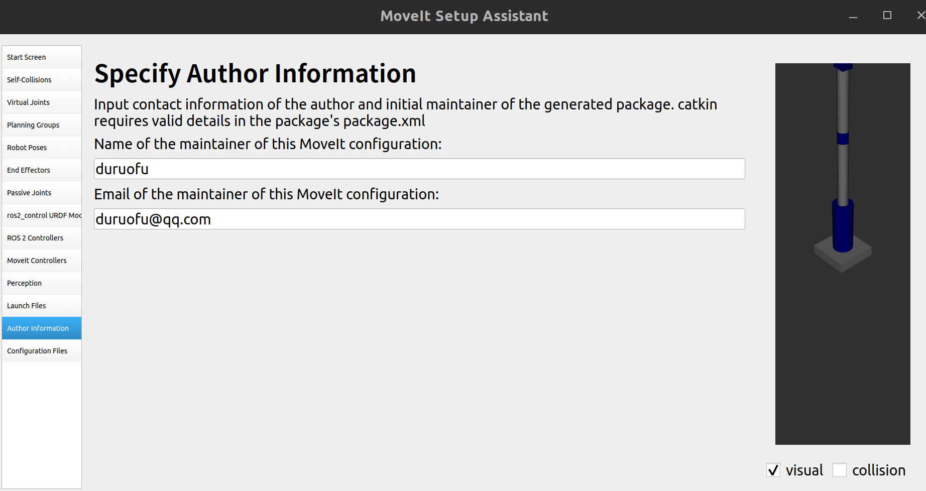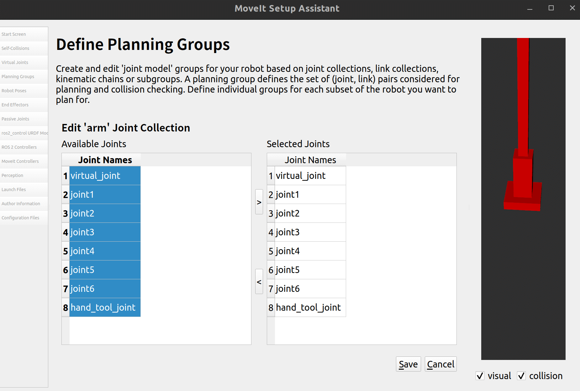 sudo apt install ros-humble-moveit-setup-assistant启动(在工作区目录下启动,否则下一步选择urdf文件会闪退):