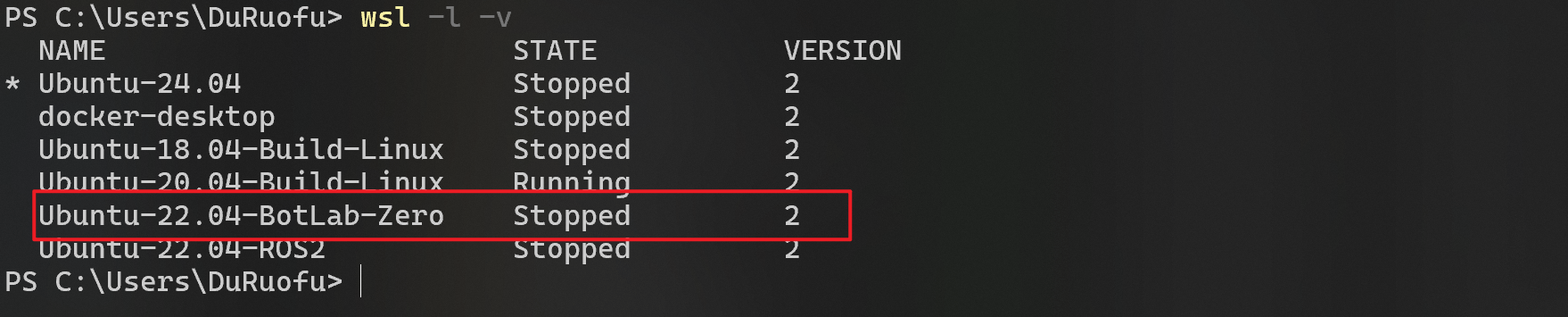 在前期的仿真阶段我们先使用WSL或者虚拟机即可,这里我准备了一台 Ubuntu22.04 的WSL2虚拟机,名字叫Ubuntu-22.04-BotLab-Zero,如下图:
