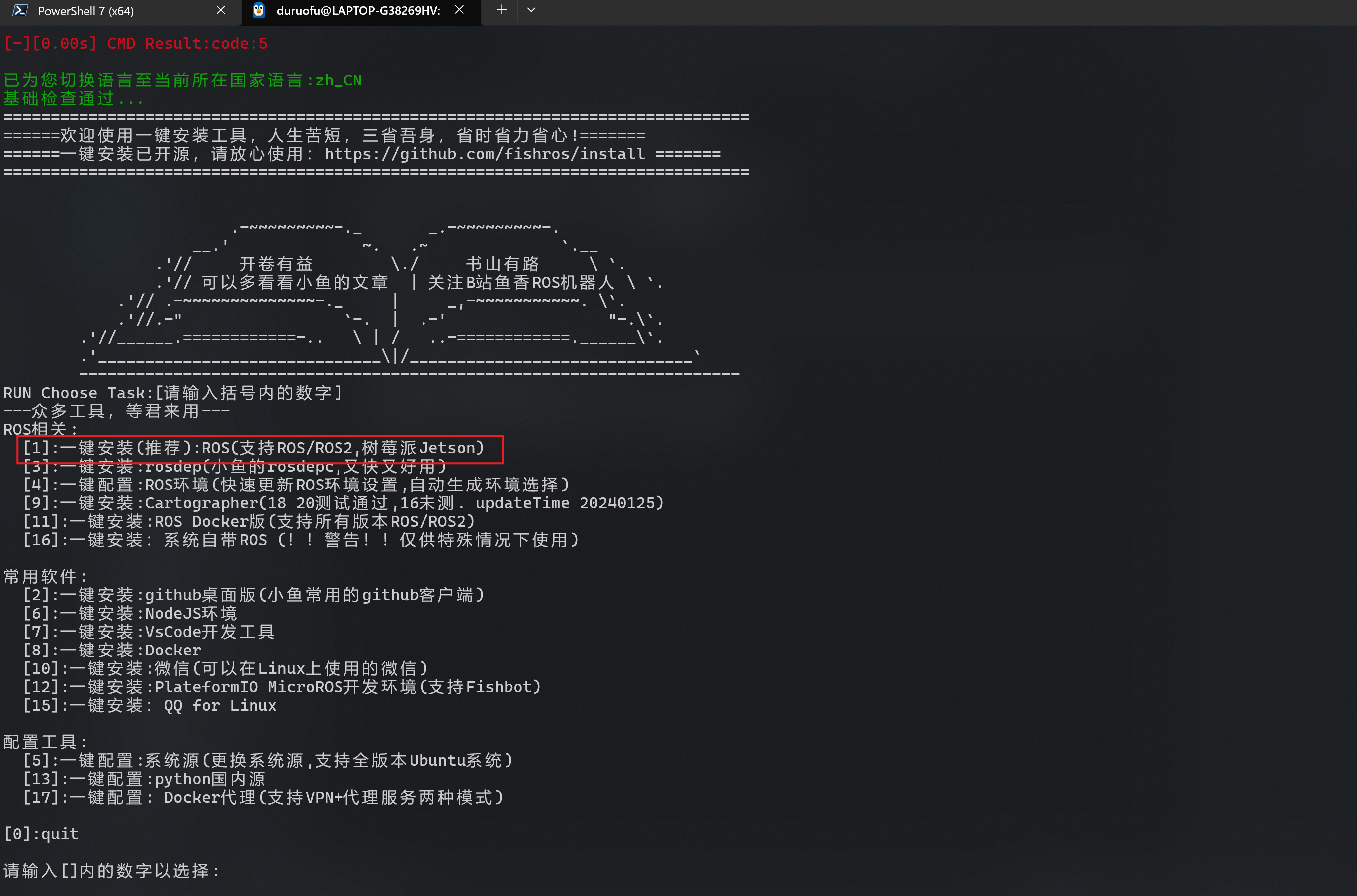 wget http://fishros.com/install -O fishros && bash fishros选择安装ROS: