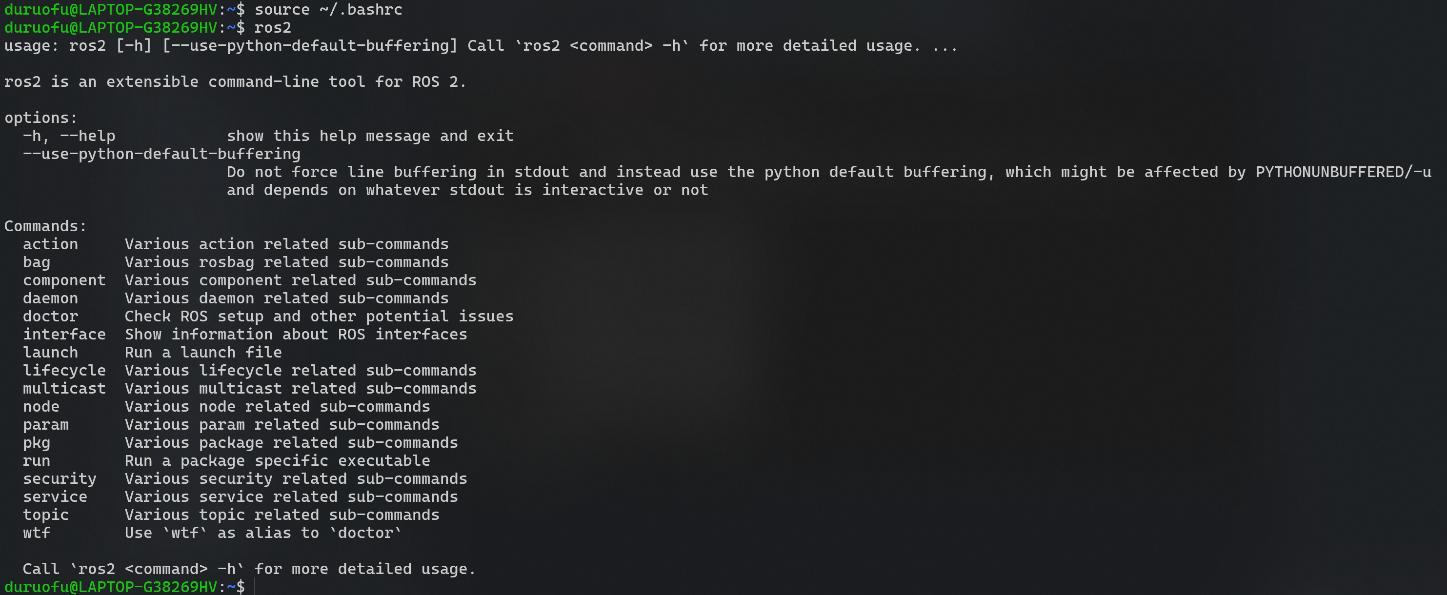 使用命令source ~/.bashrc重新加载环境,使用ros2命令检验安装成功: