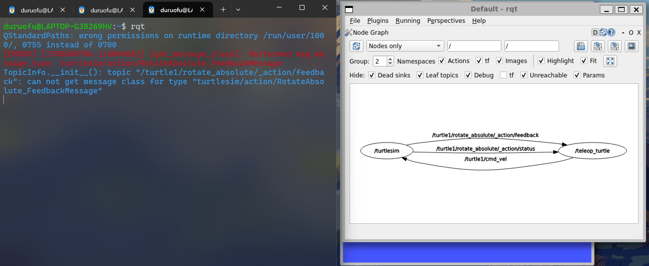 在WSL环境下,可能会出现无法使用键盘控制节点去控制海龟的情况,这应该是某种bug,可以通过打开rqt 软件刷新node graph就能正常控制了。